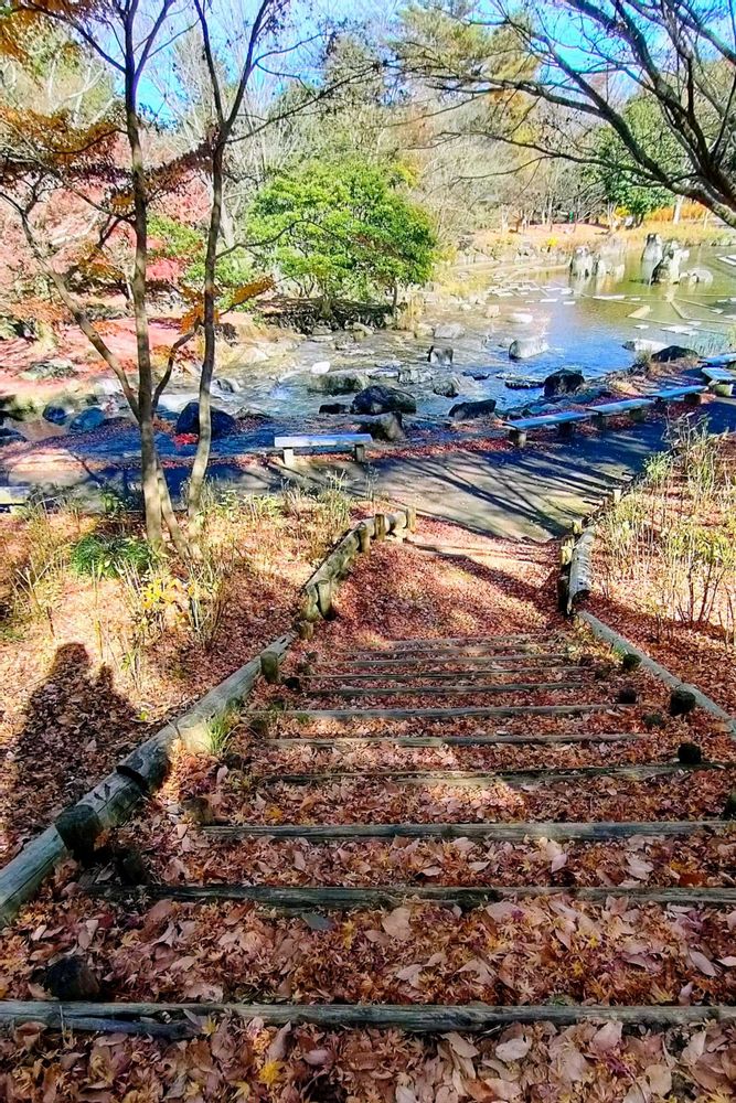 落ち葉の階段、影も散歩してるようで素敵な一枚ですね😊