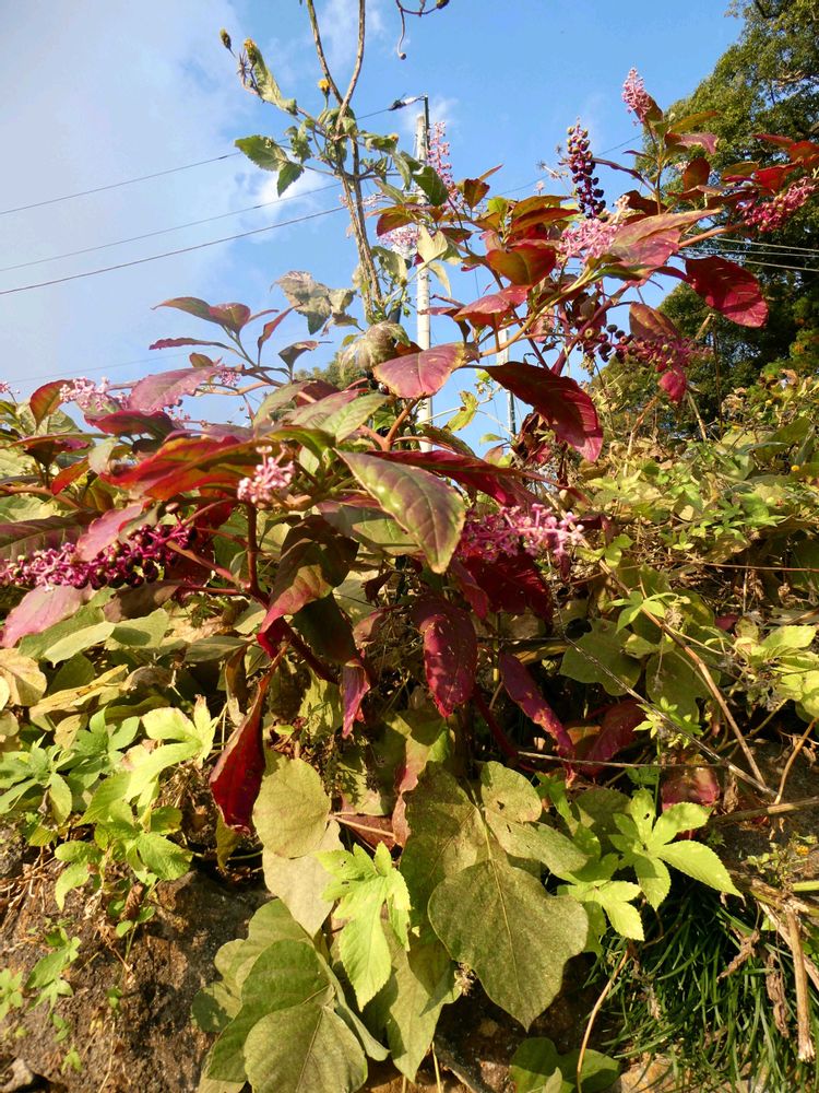 花後に花穂は果穂になり…黒紫紅色のブドウの様な液果がたくさんついていたヨウシュヤマゴボウの葉も赤く紅葉🍁していました😊