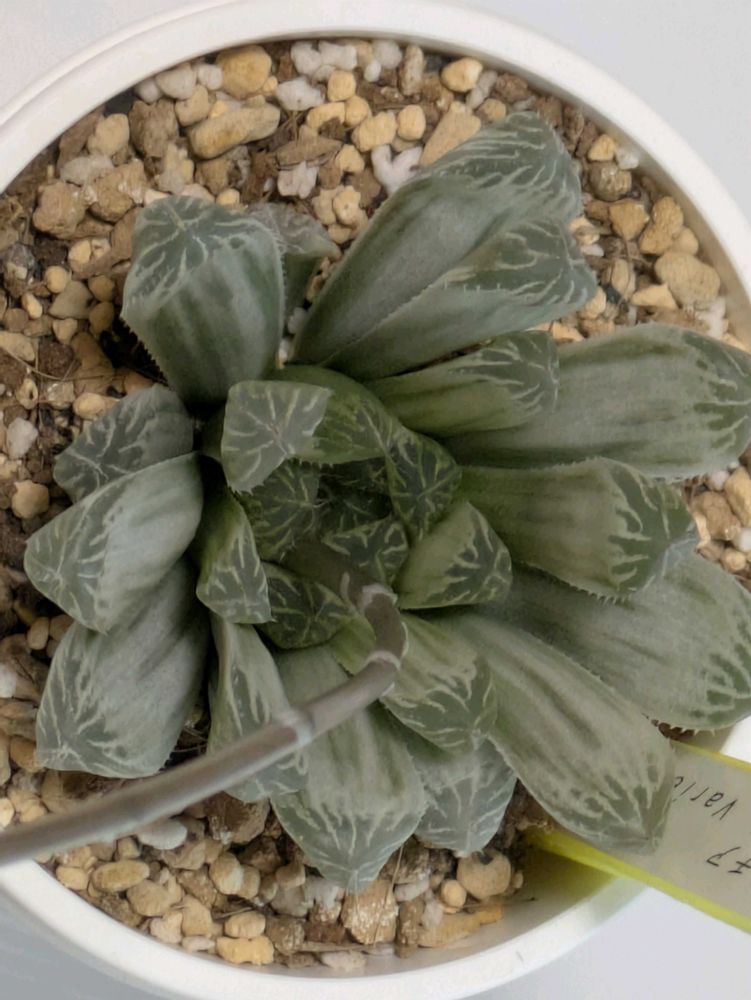 ハオルチア cooperi錦 気がつけば 花芽が上の棚網に当たっていました🙂