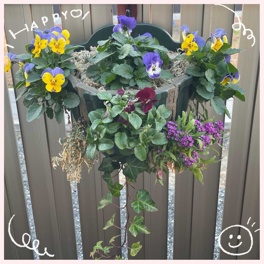 ハンギングバスケットのビオラとアリッサムが大きくなってきました♬