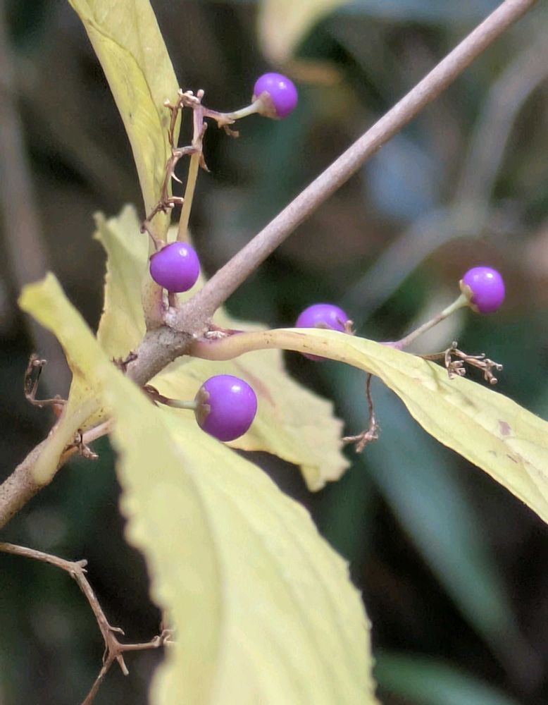 ムラサキシキブはスッキリと葉柄の基部から実柄が出る出る所や、まばらにつく所が、庭にあるたわわに実るコムラサキとは違うわね💜