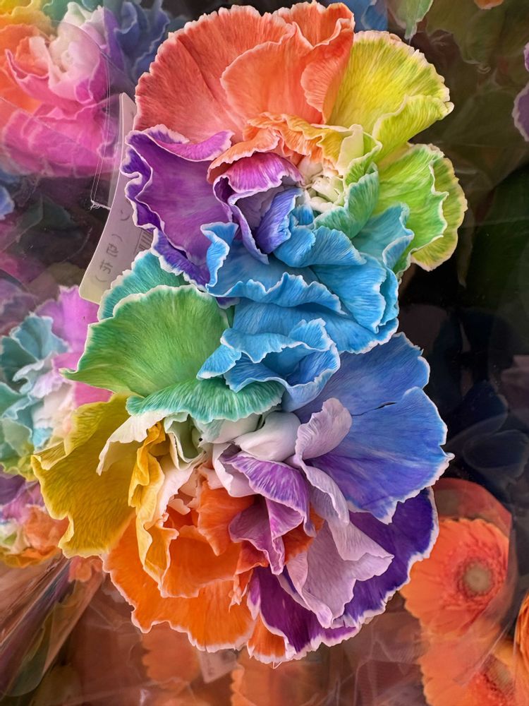 青いバラは色あげしてあるのを買った事ありますが、カラフルなカーネーションは初めてみました