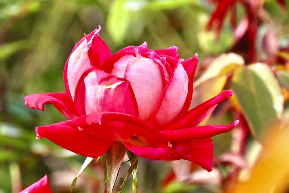 剣弁高芯咲き10㎝。花弁は表が赤 裏が白の鮮やかなコントラストの覆色花。小ぶりで多花性。四季咲き。耐寒性があり、寒冷地での栽培に適するとか🌹