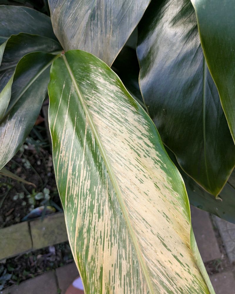 さすがに月桃の葉っぱは、ダメになってきたので切り戻しします、斑入りじゃないですよね。
