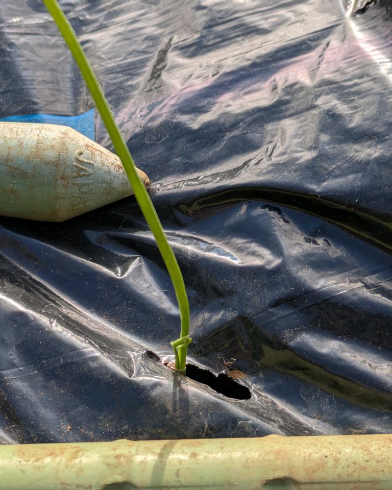 昨日の強い風で、細い玉ネギ苗のビニールが、持ち上がり、悲惨な姿に。