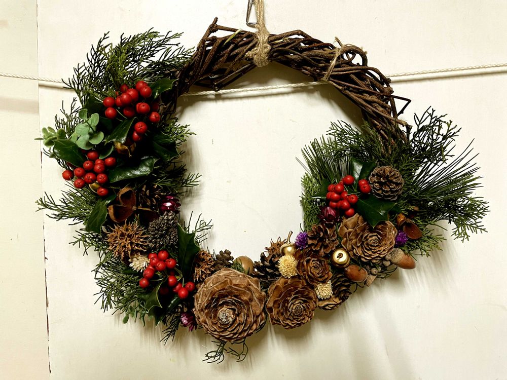今年の0円リースです。庭のアケビの蔓で土台にし、サイプレス、松でベース、飾りは西洋ヒイラギ、公園や森で拾ったシダーローズやドングリ類で