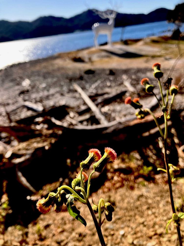 白い鹿の下には花を落としたベニバナボロギクの群生!