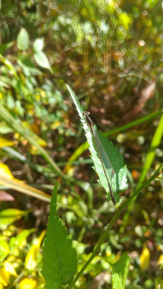 オツネントンボという冬をこのまま越すトンボのようでした。細すぎてピントがなかなか合わず。葉っぱ🌿はヤマブキです。