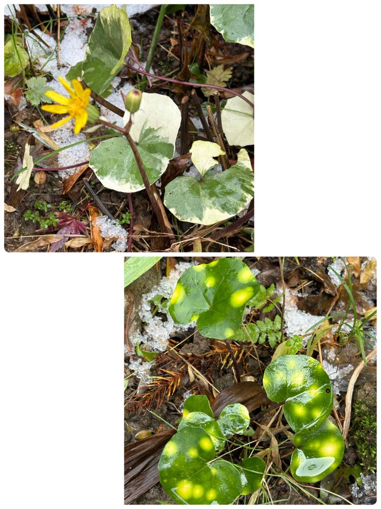 ツワブキの斑入りと星斑の葉っぱがうっすら雪とともに美しい⭐️❄