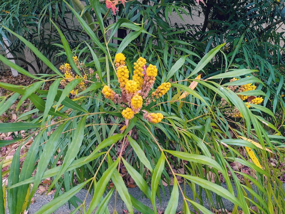 仕事場にいく途中の目立たない場所に美しい花。名前がわからずグリーンスナップにきいて知った、ホソバヒイラギナンテン。