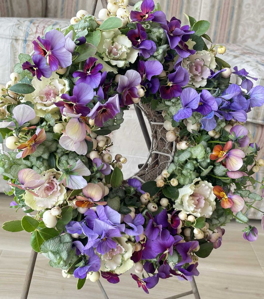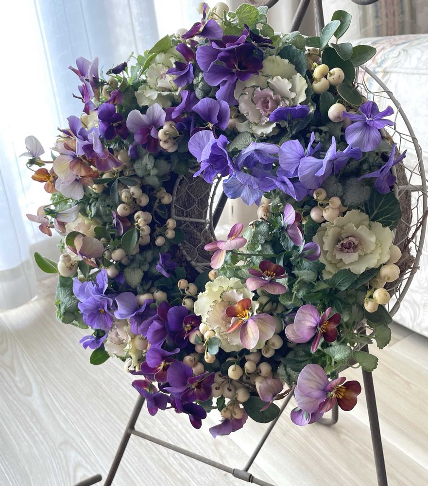 葉牡丹と大人っぽいビオラを合わせて、ちょっと重厚で大人っぽいリースになりました