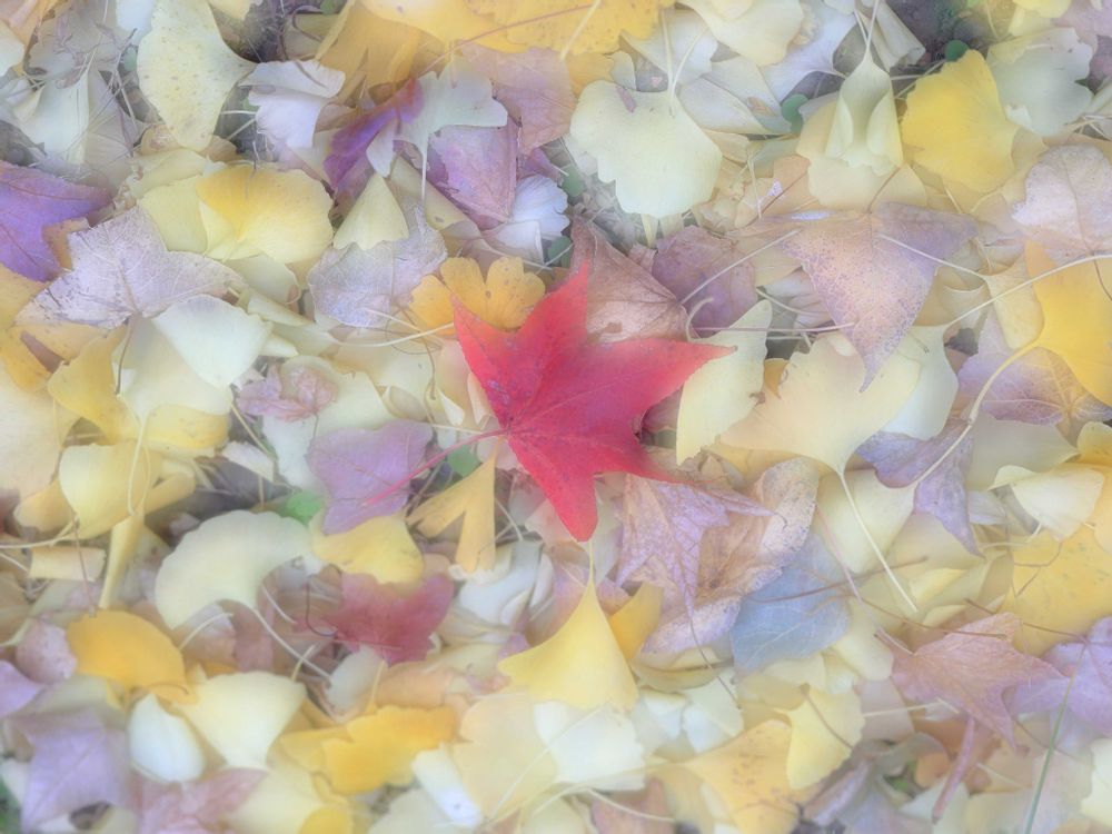 銀杏の葉っぱの絨毯に、モミジバフウの葉っぱがヒラリ♫🍁