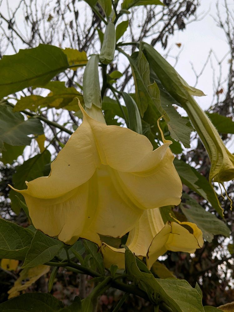 エンジェルストランペットが頑張って咲いていますが気温が下がったからなのか本来ならオレンジ色なんですが黄色で咲いています。