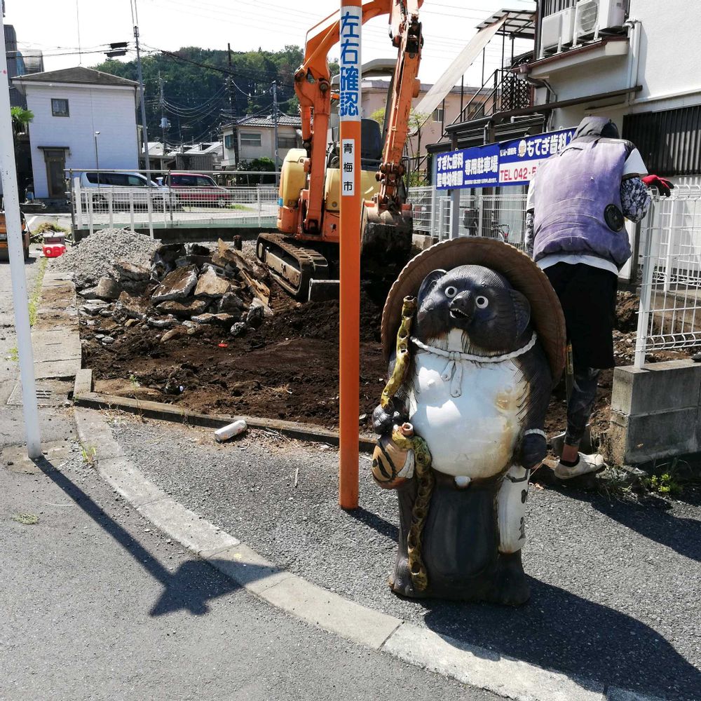 5枚目の青梅の仕事中のおっさんとタヌキは、たぶんお蕎麦屋さんだったんじゃないかな、ここ。家屋の解体の一部始終をこの位置でタヌキは見ていた、、、