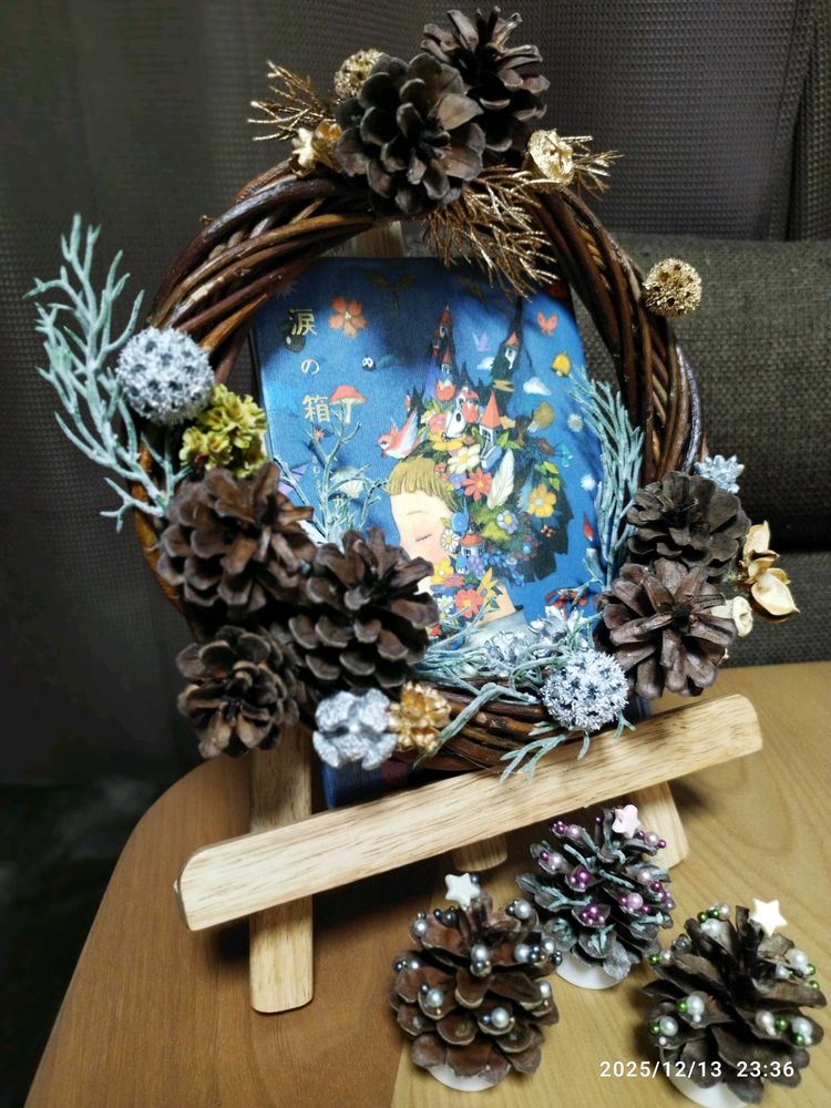 松ぼっくりのリース🎄と本の表紙💙🩵がとても似合っていて素敵ですね✨