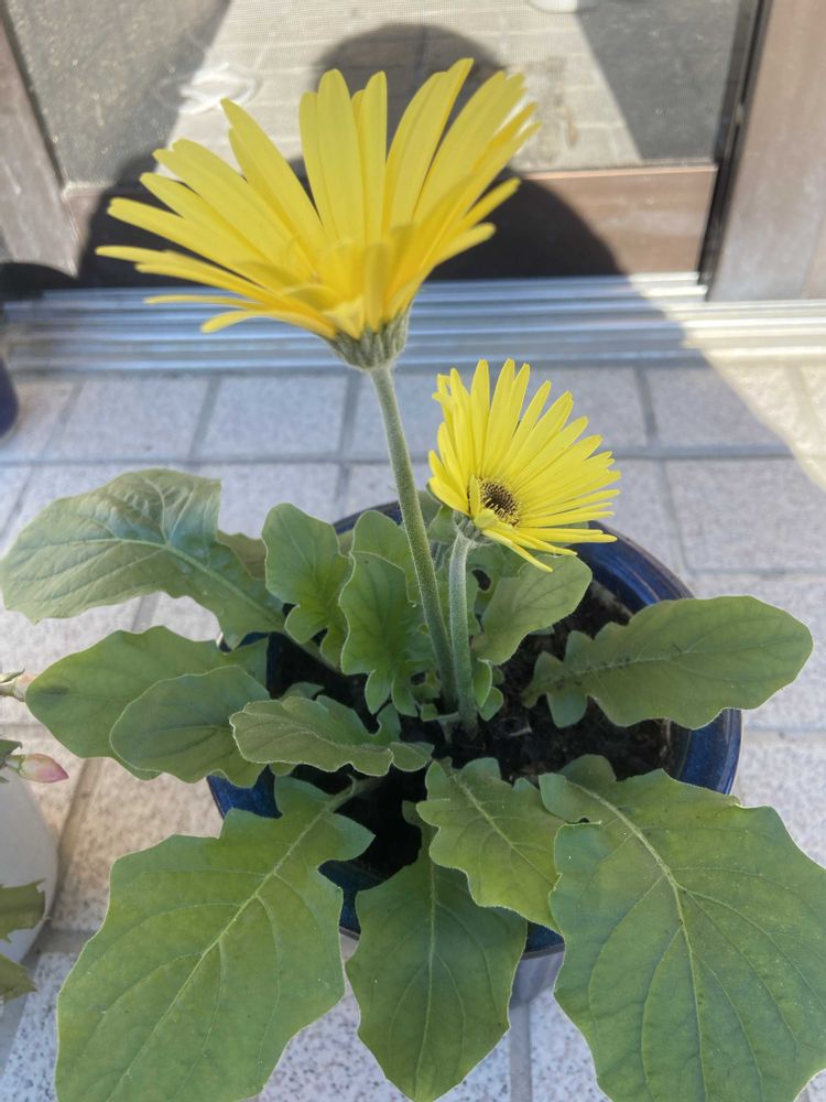 先日ガーベラの苗買い鉢に植え替えました、とても可愛いです!