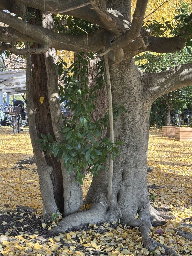結構大きな木です。根元を見ると大小2本生えていました。どっちも太いです。現在の市役所が完成して50年。この木も同じくらいここにいるんでしょうね。知らんかったな〜💦💦