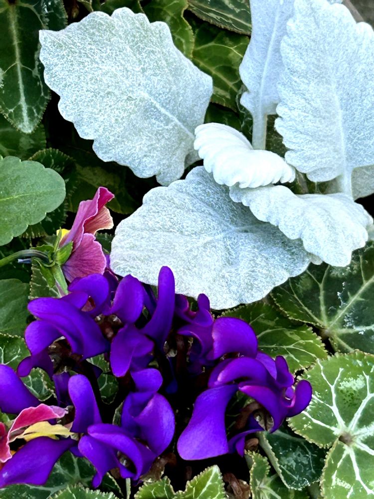 青いシクラメン ドラゴンを入れてシロタエギクやパンジーで寄せ植えを作りました🤗🌿💕🌿
