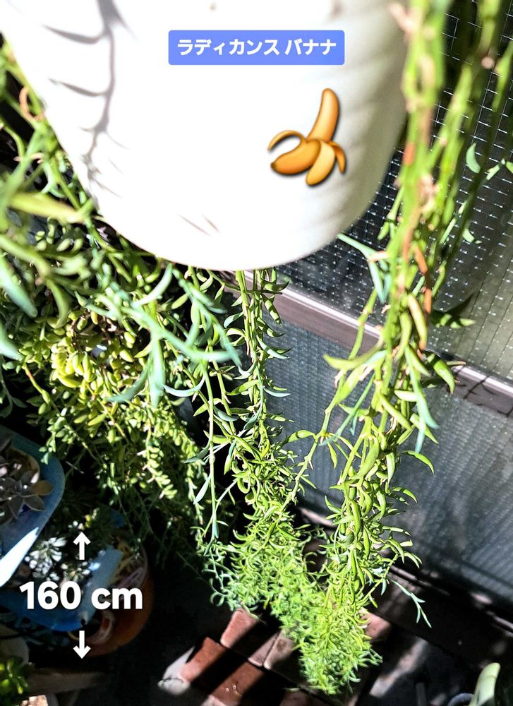 ラディカンス・バナナ🍌(三日月系ネックレス)、ビロ~ンと伸びて、分かりにくい画面となりました😅タイソー8cm鉢◎が肥大❗