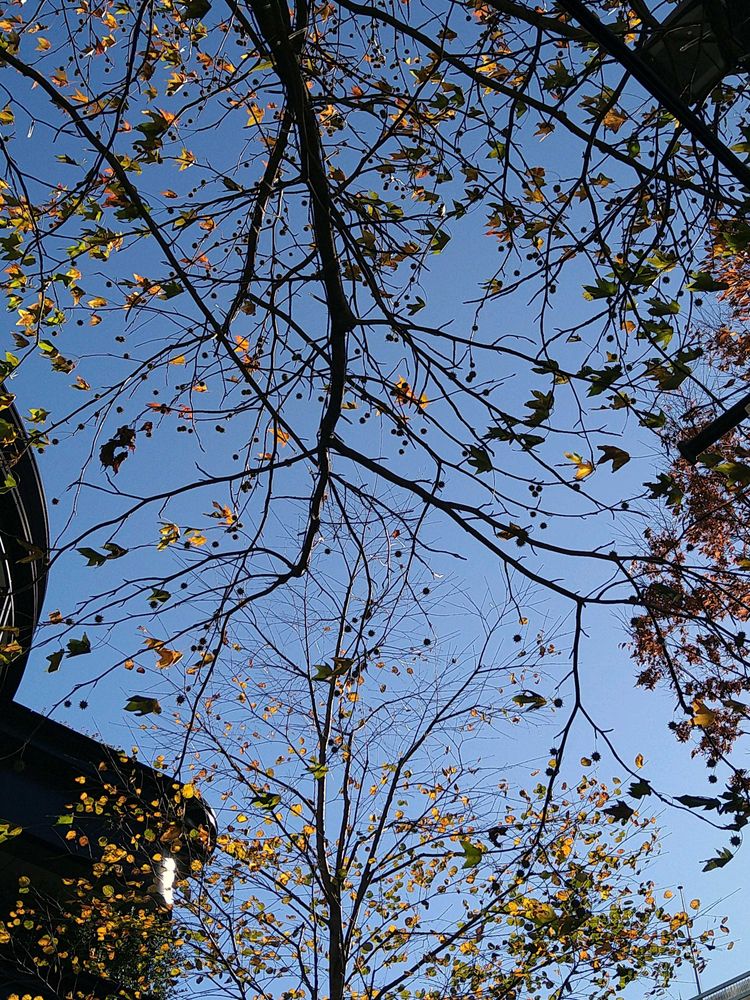 樹木の幹と枝葉と広がる青空が作り出す素敵な光景を見ることができること
