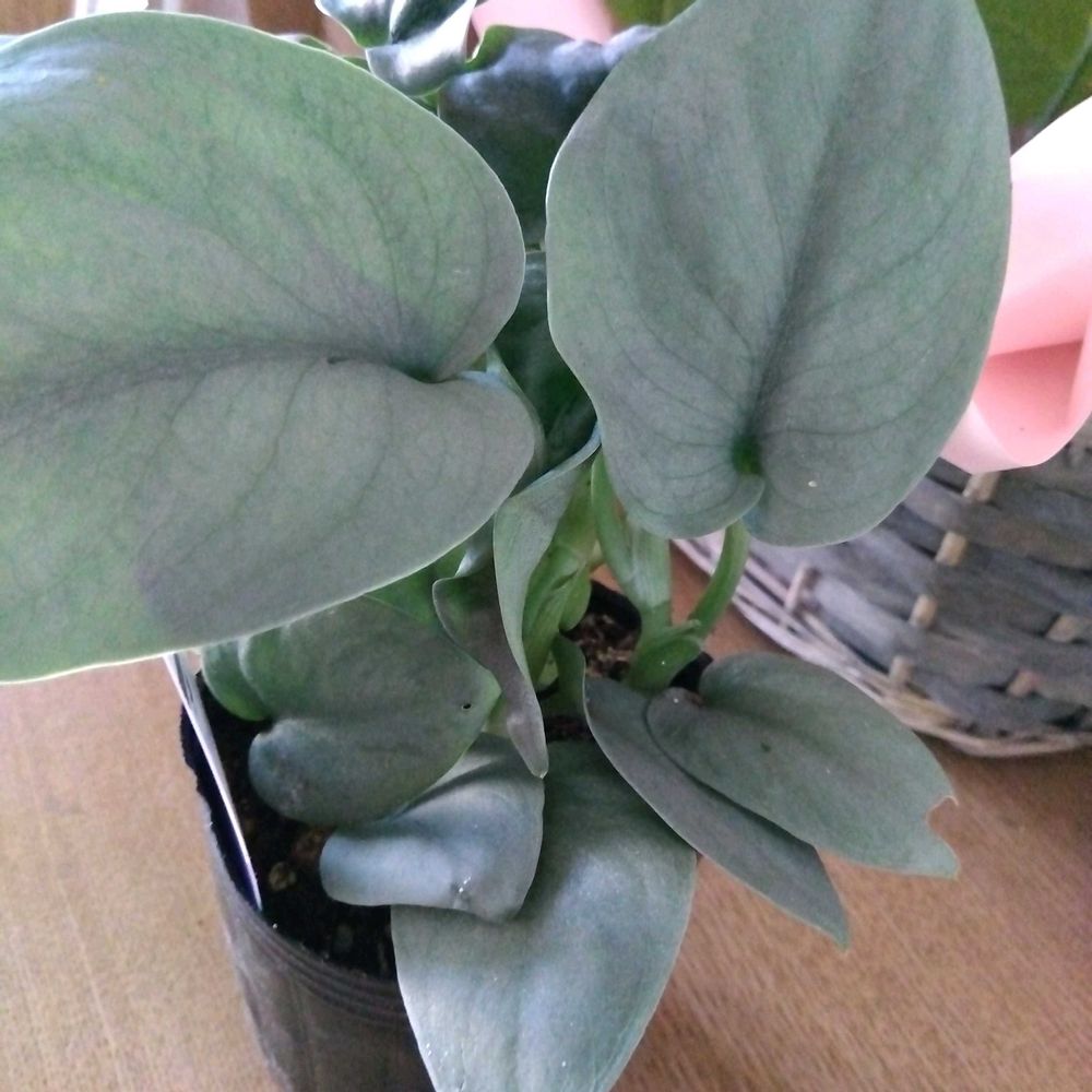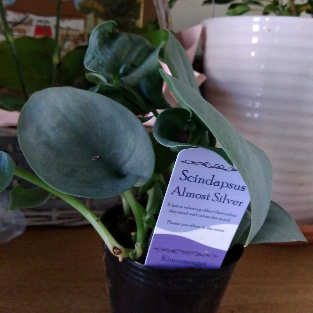 スキンダプサスオルモストシルバーという観葉植物で、葉の色がシルバーがかっていて、不思議な色合いで素敵です🩷