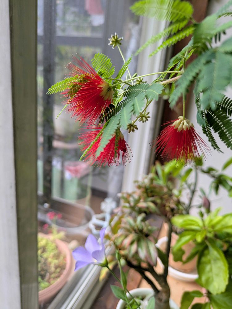 ヒネムは緋色のネムノキ、ネムノキは、大木になってから花が咲くのに対して、ヒネムはきさ小さくても咲きます。そして寒さに弱い木です。