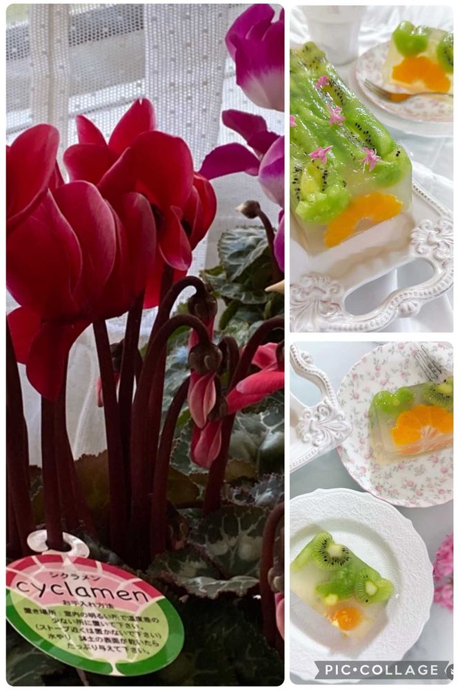 ☘️シクラメン☘️....光を受けて咲く冬場の定番。赤色にピンク色にと出窓が賑やかになりました😍右側は愛媛からのミニ紅まどんなとキウイを使ってゼリーにしたと。東京の孫娘👧🏻が作りました。中1の綺麗な工夫に心が弾みました💕👍🫧🫧