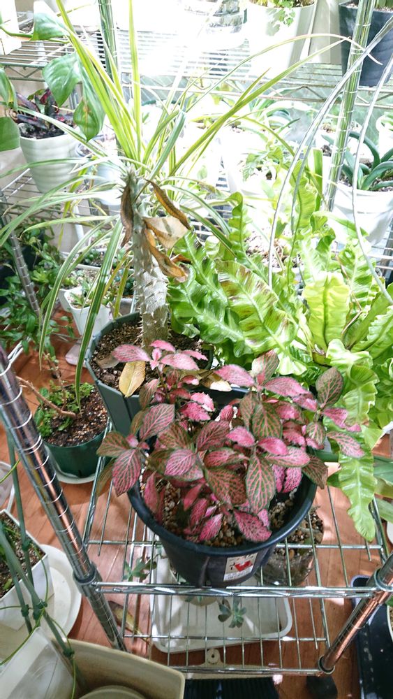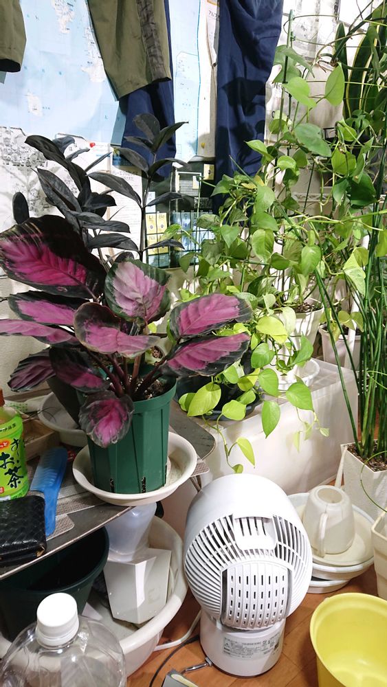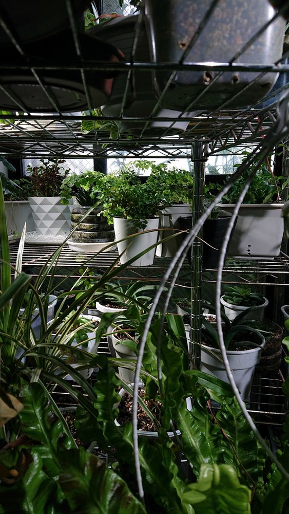 🐒🌿色合い とか考えて無いです。 ベランダ出すと弱るから〜、🍃 ローテーションで部屋内に置いてあるだけですよ〜。 植物育成ライト💡🔦の光当たるように工夫してま〜す。スチール棚