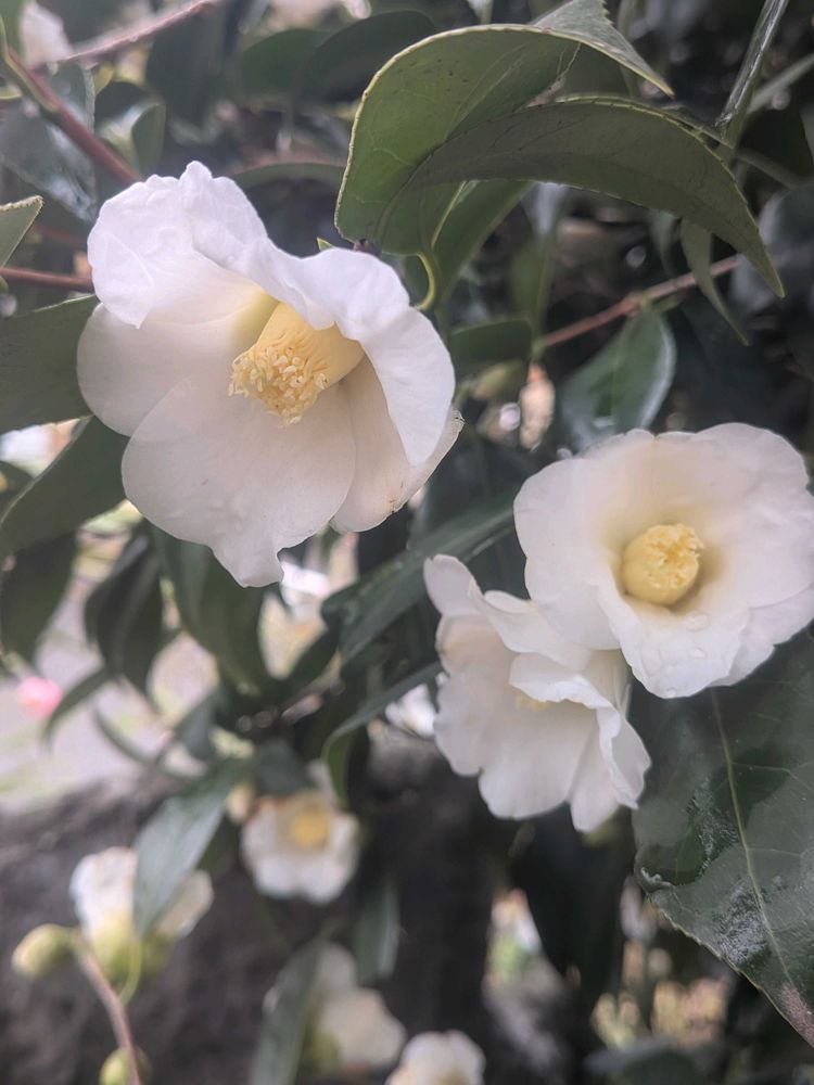 ④侘助(椿)たくさん咲いてるけれど風当たりのいい所は傷んじゃってます💦 清楚な侘び寂びの感じが好きです♥