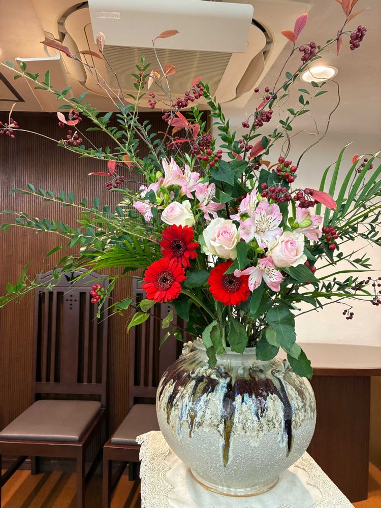 ②講壇の花は、ガーベラとバラ🌹🌸 牧師夫人が生けられました