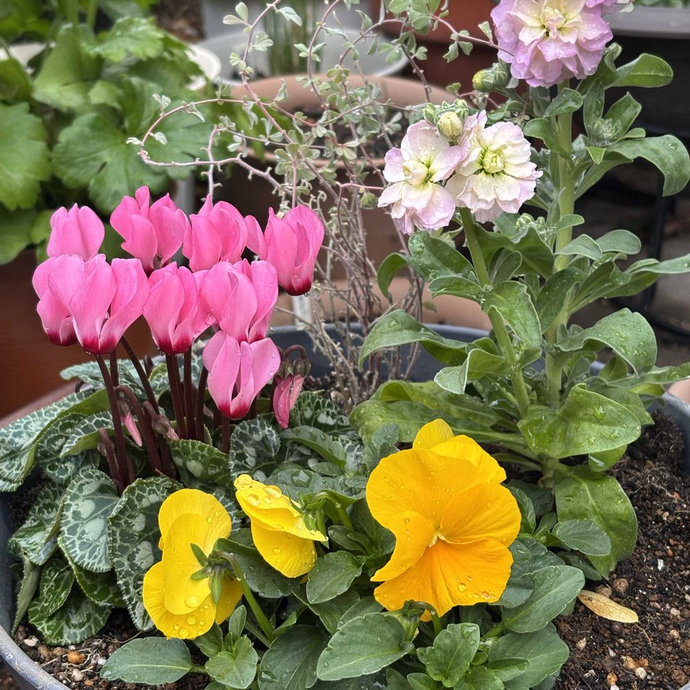 寄せ植えも綺麗💛🩷🤍💚💖👏