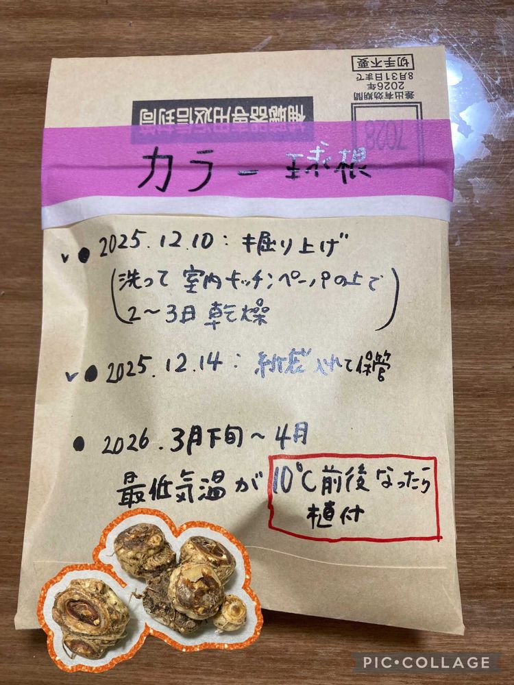 掘り上げた【カラー】の球根、乾燥が終えたため、冷所保存へ。