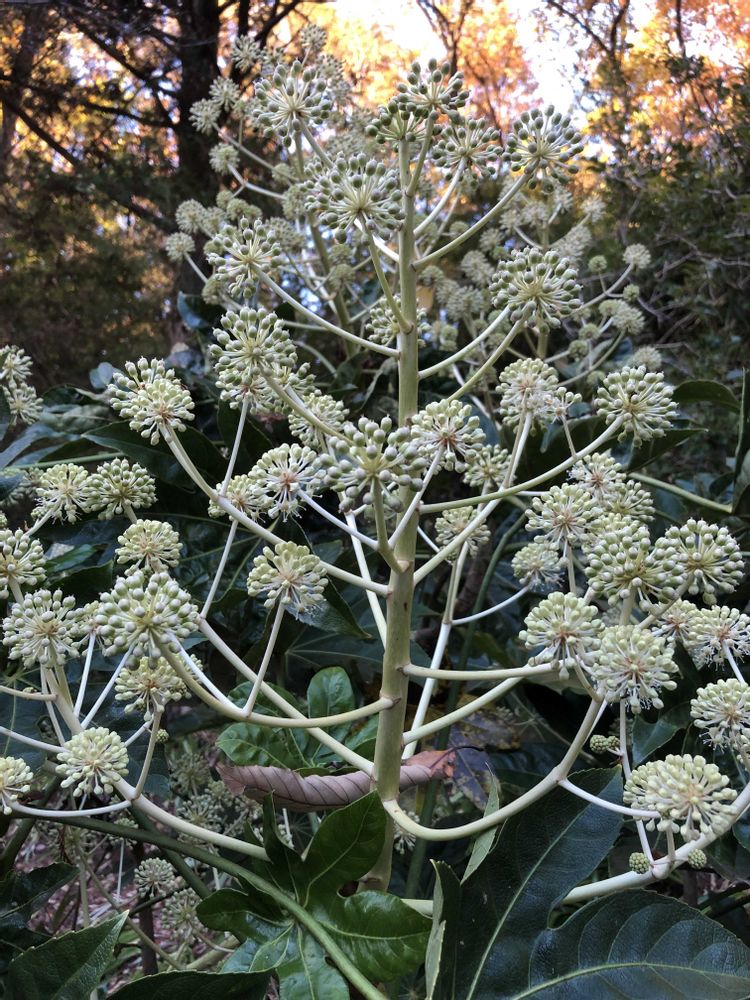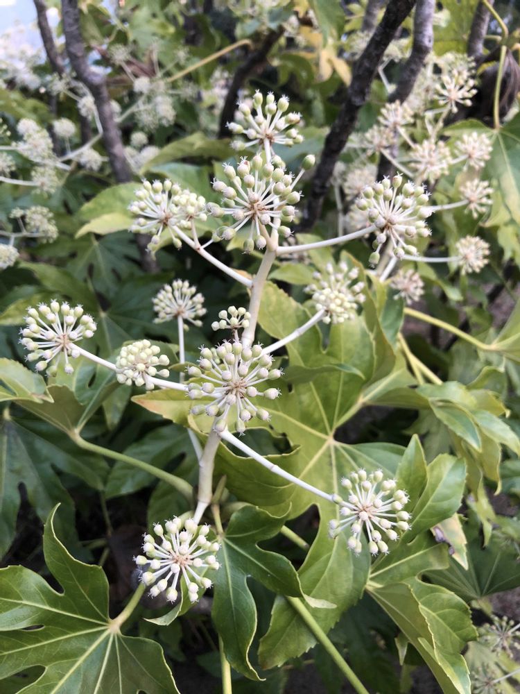 「ヤツデ」は、ウコギ科ヤツデ属の常緑低木。白い花火のようなお花🌼が咲き、黒い実●を付けます。🌿😊👌