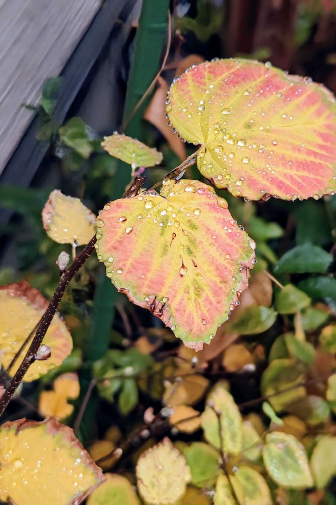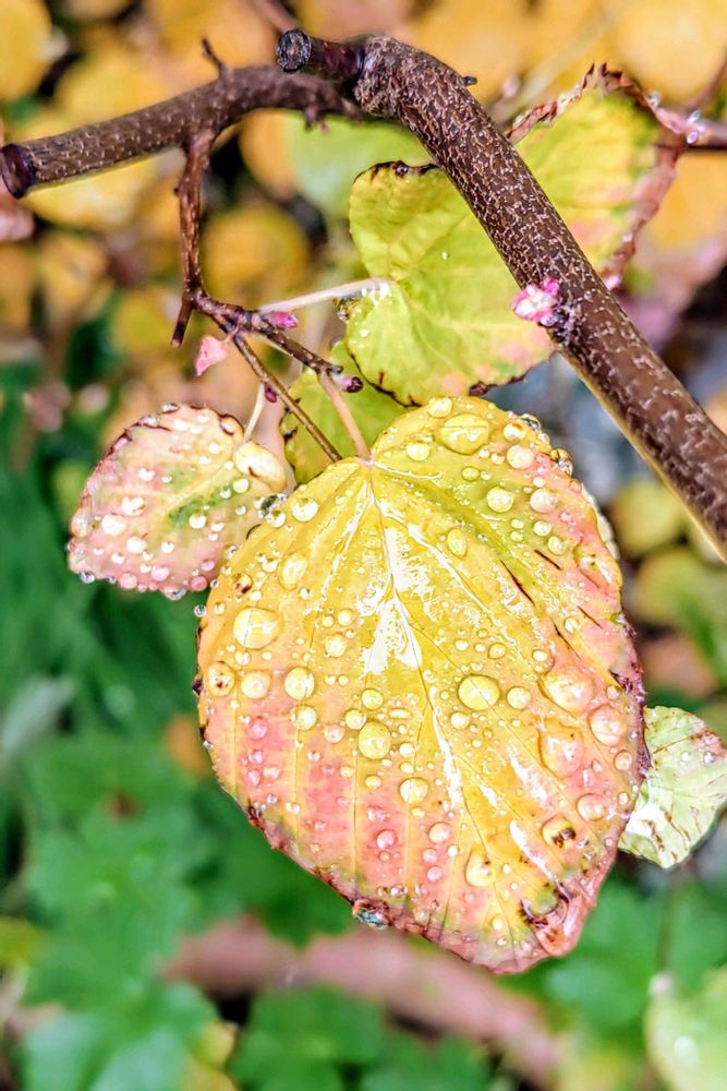 ヒュウガミズキの黄葉、溝のある葉っぱ好きです💕そこに雨粒☔️、綺麗に撮れてますね。