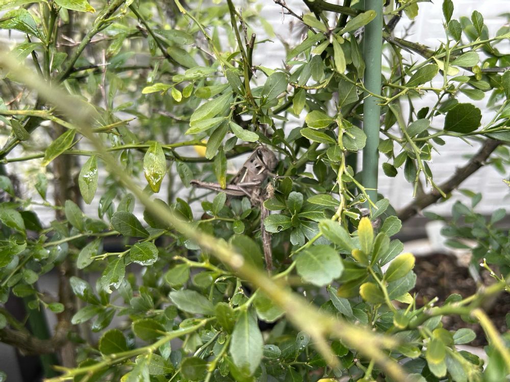 12月に入ってから、トノサマバッタがフィンガーライムの幹に止まってますが、バッタって越冬できなかった気がするんですが、じっとしてるんですよね。触ると少し動くし。