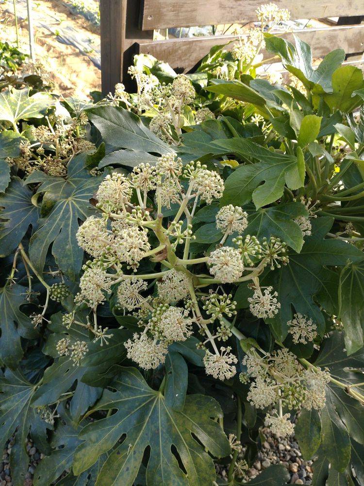 お早う御座います今日晴れ、今日のお花ヤツデ咲いてます。