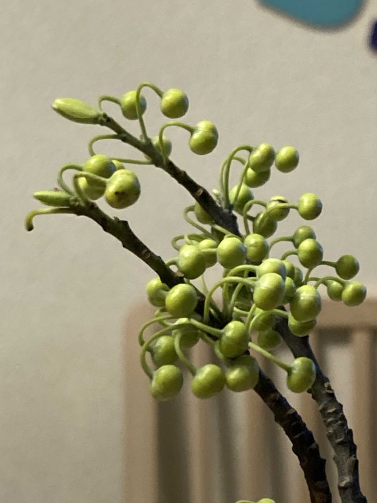 開花直前になると黄緑になり、苞がはじけて複数の花が咲くそうです。