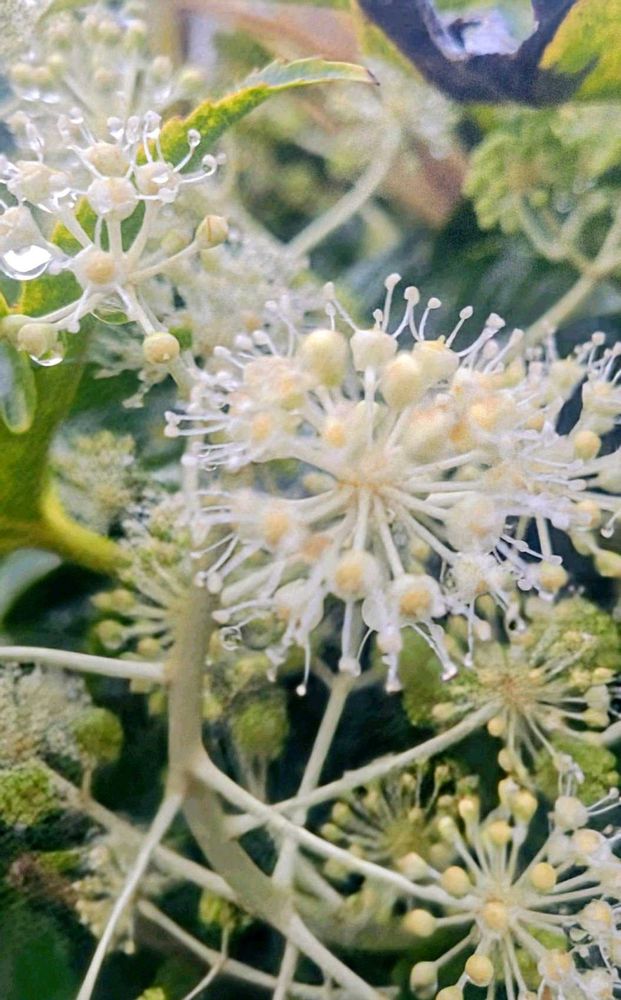 ヤツデの花も美しい、ナンテンの実もたわわに実りましたね!