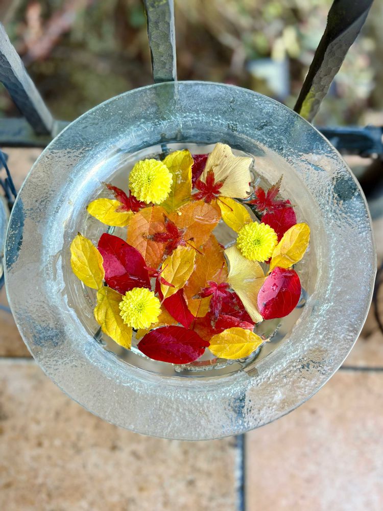 庭に出たらいろんな色の葉っぱがあって、でも落ち葉アートするほどの量はないから水に浮かべてみました。