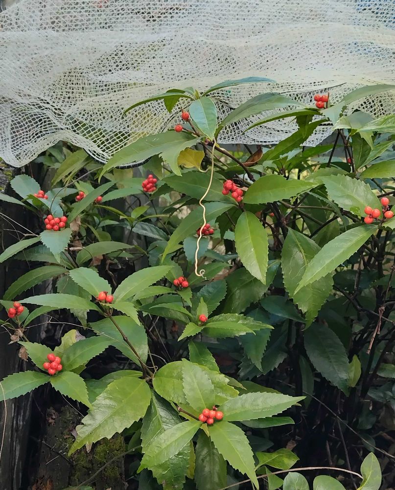 ピラカンサの事もあり、ネットを被せた千両の実は大丈夫かな…と思って見に行きました😅