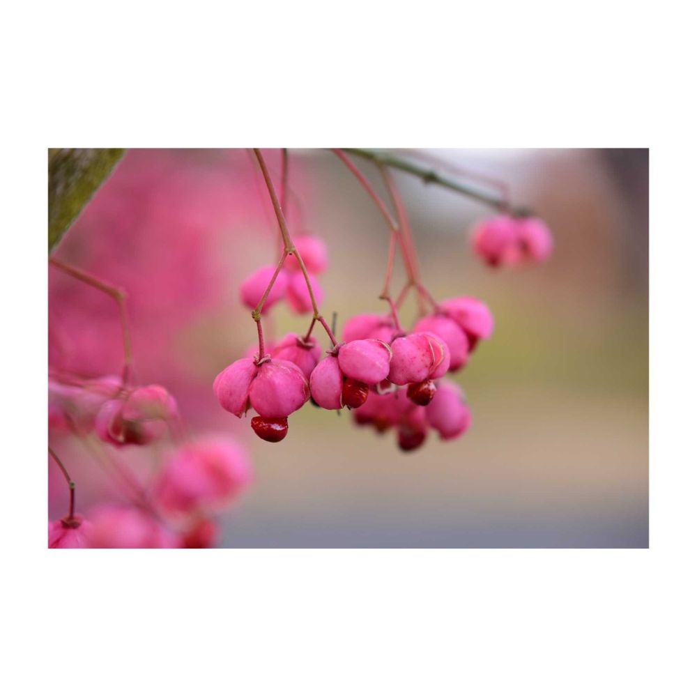 朱色がかった赤色の四角い果実で、熟すと中から、紅オレンジ色の仮種皮(かしゅひ)に覆われたタネが現れ、落葉後も残ります。