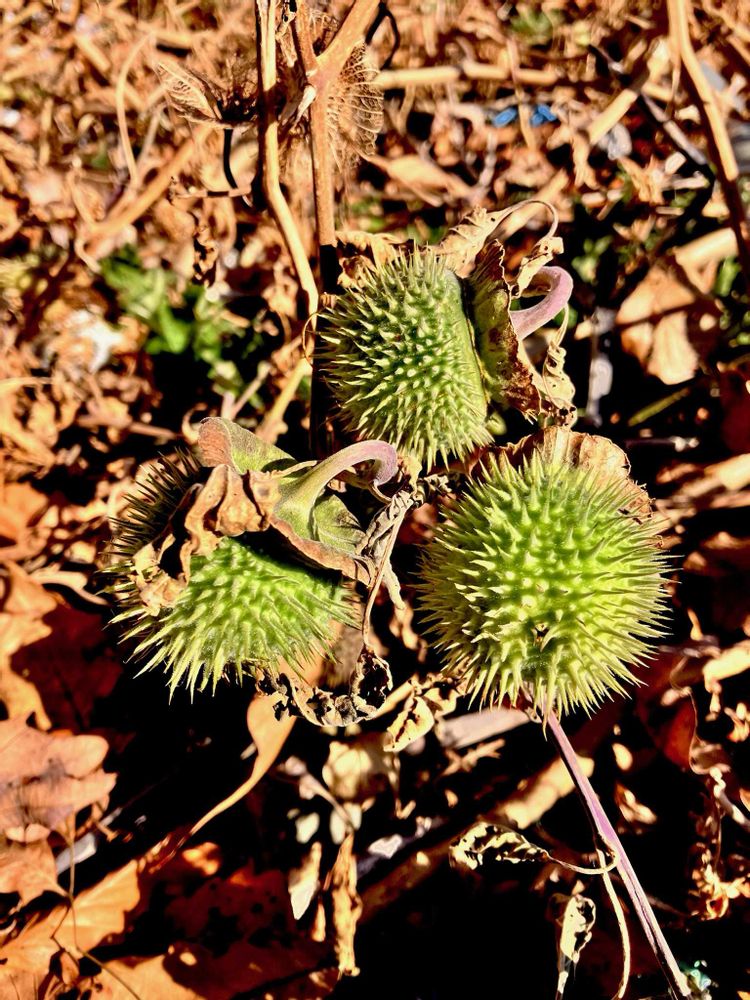 ここは、例の白い鹿がある側なんですが、以前に見たヨウシュチヨウセンアサガオとは違うトゲトゲに興味をそそられました。とても地味ですが、ヨウシュの付かないチヨウセンアサガオの果実だったんですね♪