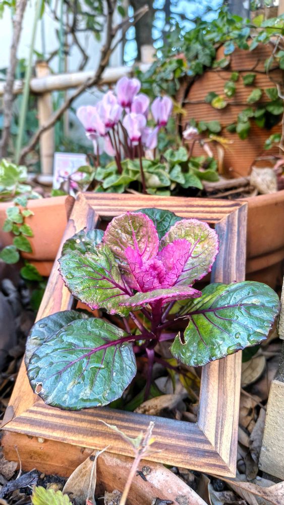 昨年の葉牡丹がビヨ〜ンと後方から伸びて来たので、捨てられていたフォトフレームで居場所を作った。