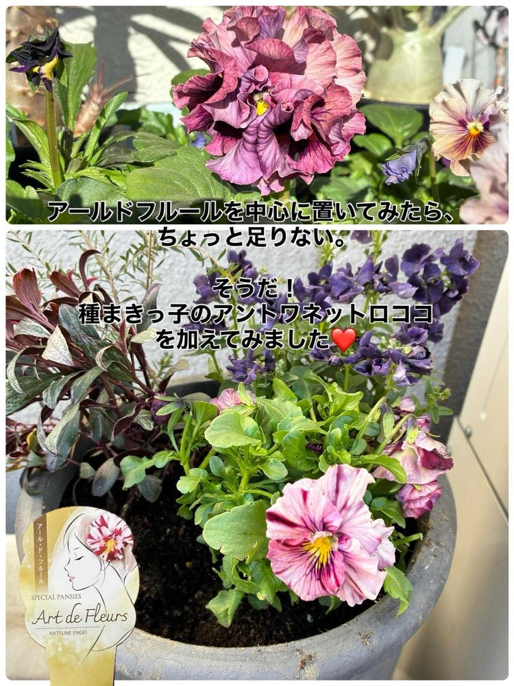 2枚目の下ですが、少しスペースがあり、どうしようかと考えていたら、種まきっ子の開きかけのアントワネットロココを思い出し、色が合うので採用しました!