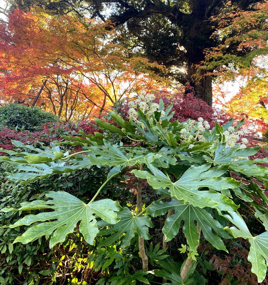 紅葉バックにヤツデの葉っぱがツヤツヤで綺麗ね🌿.∘