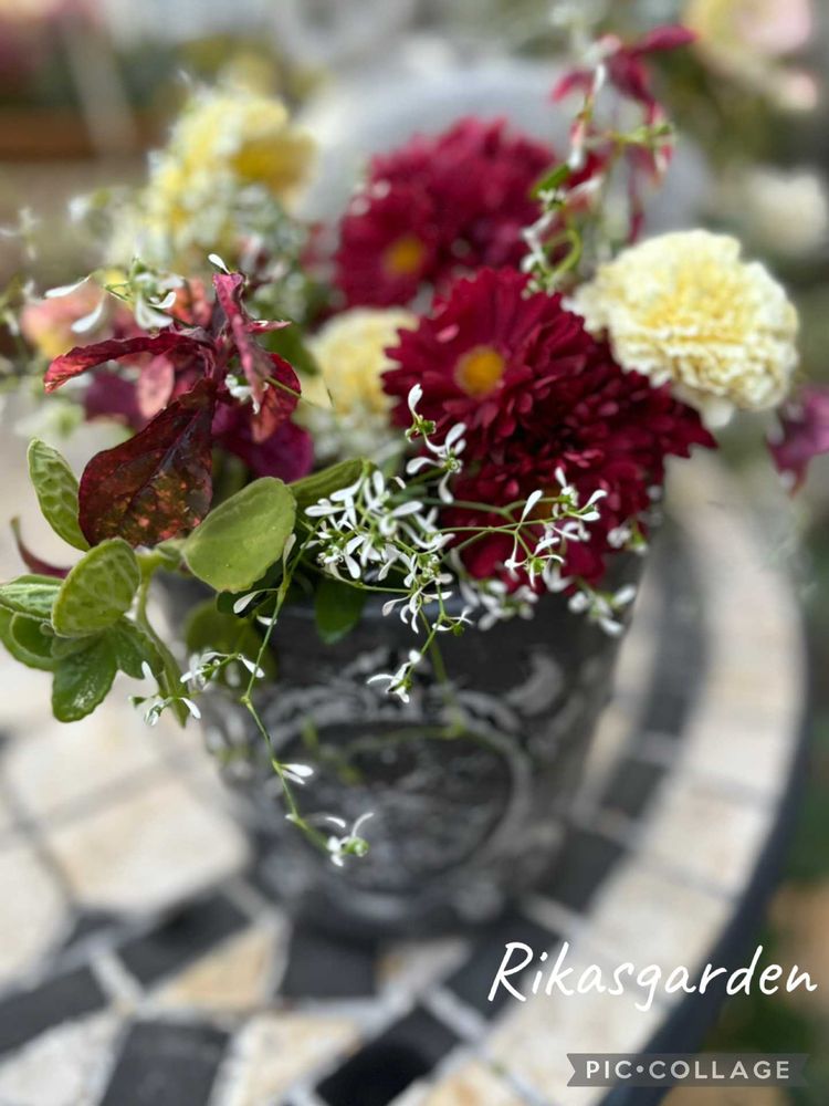 ⑤犬友さんの花友さんからエンジの菊を頂いたので、庭の花と生けてみました。