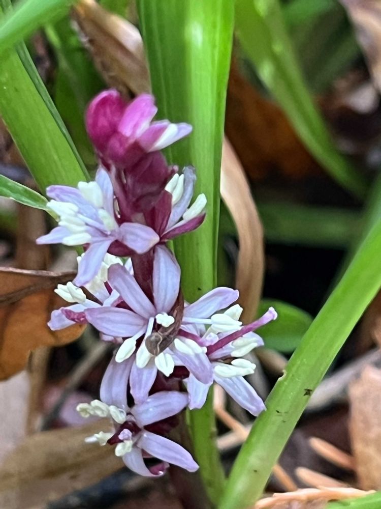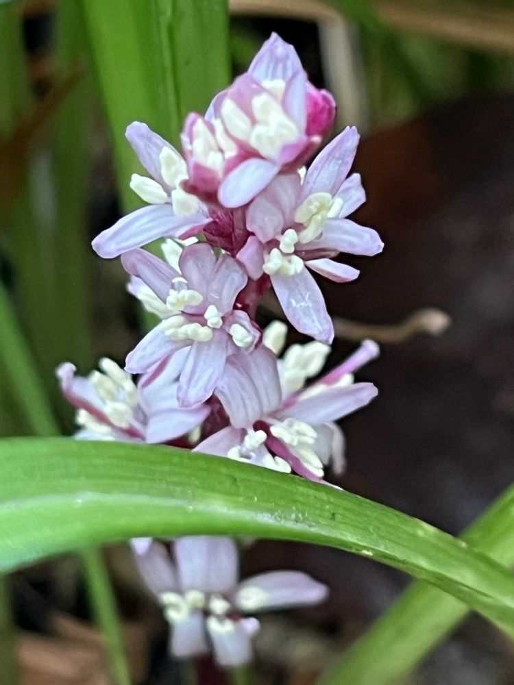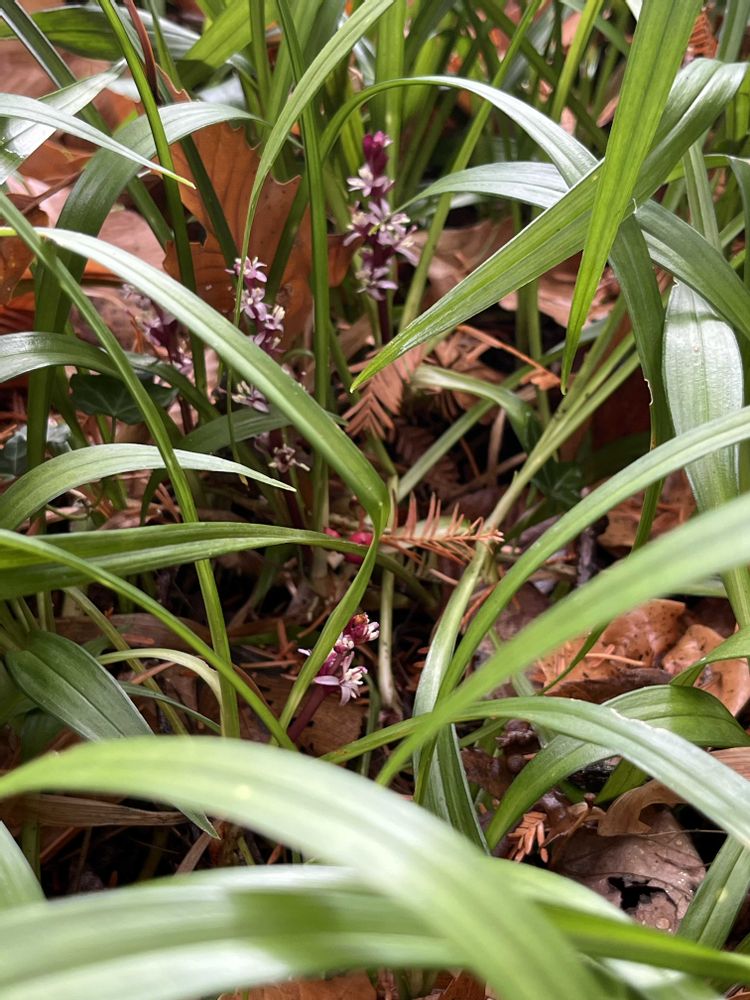 私は初めて見たのですが、植物園の見頃の植物の案内図を頼りに探してみたものの、なかなか見つからずに右往左往、ヤブランに似た葉に隠れるように咲いていました😅