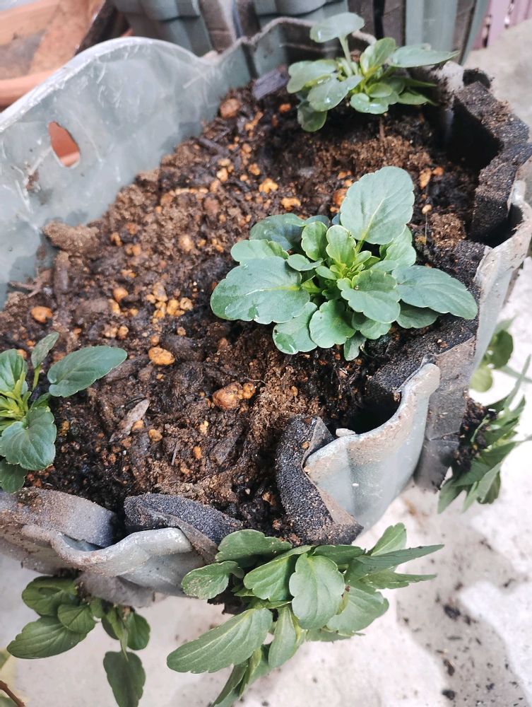 9/14に種まきしたビオラ、まだ葉っぱだけだけど、スリットバスケットに定植しました😊