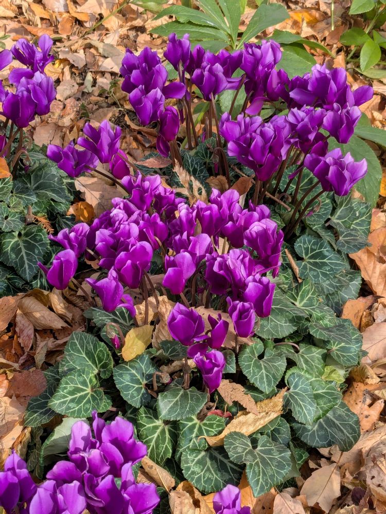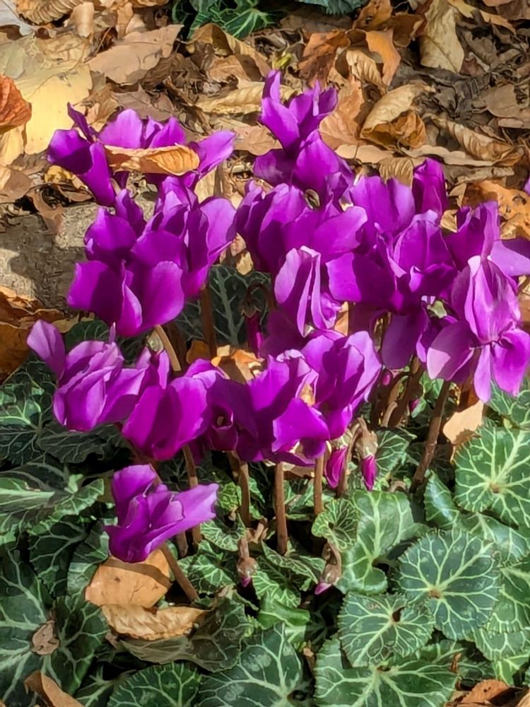 シクラメンとすみれちゃんです😀ここ、シクラメンが地植えなので、いつも、驚かされます😄それも、毎年、違う種類なので、造園屋さんの苦労が、うかがわれます😀