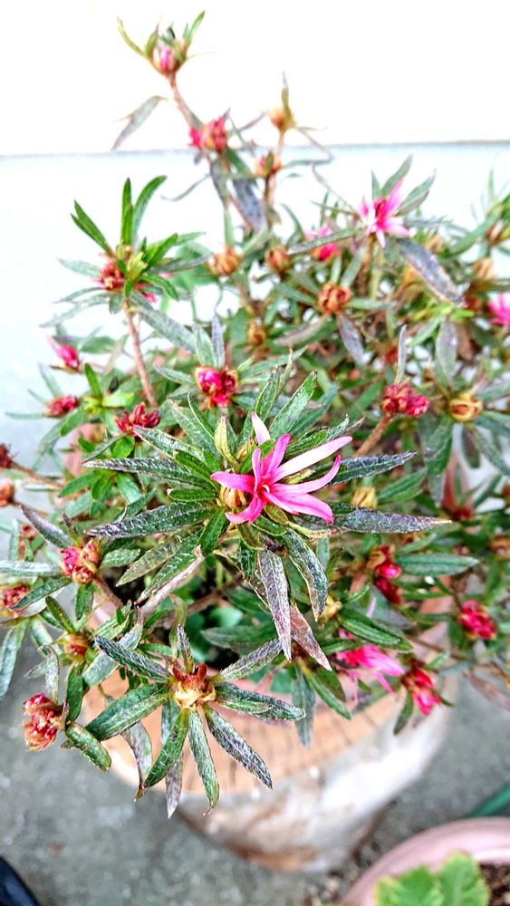桃紅色の細長い花弁が深く切り込み、八重咲きになる珍しいツツジで、今年の春に一目惚れして購入しました❗